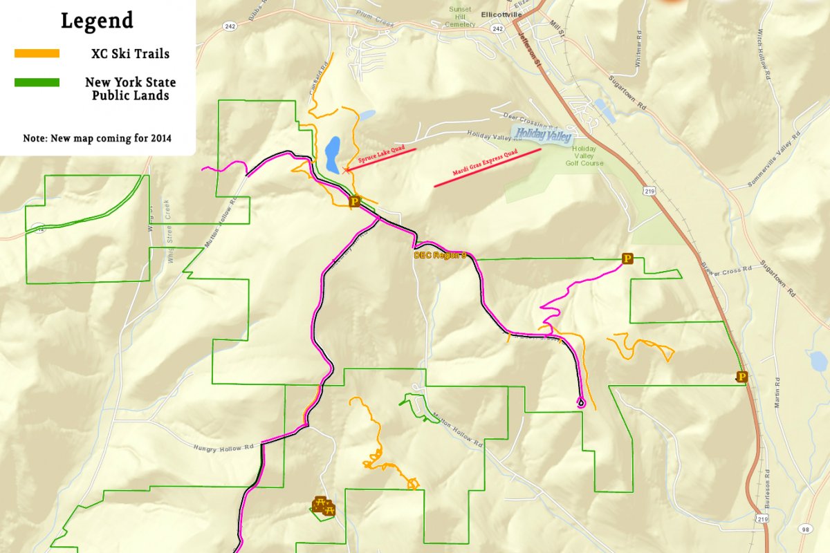 Home Cross Country Skiing Go Cross Country Skiing for a great cardio workout! We are home to Western New York's largest cross country ski trails, the Art Roscoe Ski Trails. We have trails for all levels of skiiers, beginners or advanced. If you're new to XC skiing, learn and practice in the woods on groomed trails of the Art Roscoe Trail System at Allegany State Park (rent a cabin right there!). If you're an experienced cross country skiier, try the back country trails at Holiday Valley Resort. Try out some of our best available places to cross country ski, or make your own path through our beautiful landscapes and rolling hills. Popular opinion is that the Art Roscoe Trails at Allegany State Park are the best! Art Roscoe Cross Country Ski Trails at Allegany State Park Allegany State Park offers some of the top cross country skiing accommodations around. One of the most well known trails within the park is the Art Roscoe Cross Country Ski and Mountain Biking Area. Offering over 18 miles of groomed trails for both cross country skiing and skating, the trails, themselves, range from beginner all the way to advanced. So, regardless of your experience, there's a trail for you! These trails are named after Arthur J. Roscoe who mapped out early logging trails for this sport. The wide scope of trails invites beginners and advanced XC skiers alike. Don't have your own cross country skis? You can rent them at the gift shop at the Red House Administration building but call first for details. The Warming Hut is open every day, but be sure to stop at the Gift Shop at the Red House Administration building beforehand if you should need to rent skis. They offer rentals Friday through Sunday from 10am until 5pm. Call 716-354-9121 or 716-354-9282 for more details. Along with the 18 miles of groomed trails, there's also over 25 miles of backcountry trails. Come check it out for yourself! View the Allegany State Park Visitors Map which includes the Summit Area View Winter Cabins at the Summit View other Winter Cabins nearby View other Lodging Cross Country Skiing Rentals at Allegany State Park Daily Rates for Adults & Children (Driver's License is required for deposit) $20 Skis, boots & poles. Prices are lowered if the complete set is not needed. Cross Country Skiing at Holiday Valley For even more miles of adventure, visit the cross country skiing trails at Holiday Valley and NYS Public Lands. Here, you can either go high by cruising ridgelines at the top of Holiday Valley or go low by circling the areas around the golf course for some spectacular views. If that's not enough, Holiday Valley Resort offers miles of trails through the mountains and the backcountry of the resort along the tracks made by snowmobiles. For complete information on pricing and cross country skiing options, check out Holiday Valley's Cross Country Skiing page. View Trails View Lodging XC Ski Rentals at Holiday Valley Resort Cross country ski rentals at Holiday Valley Resort are available. Visit HV's Rental Equipment page for pricing. XC Ski Rentals at Mud, Sweat & Gears XC Ski Rentals at The City Garage There are XC Ski Packages available, from light touring to heavy duty backcountry metal edge skis. All priced right and featuring quality brands of skis, boots and bindings. Art Roscoe Trail News Check out the latest news on the cross-country trails at AlleganyNordic.org. Cross Country Skiing Questions Do you have questions about Cross Country Skiing? Contact us with 'em and we'll do our best to help you plan your trip. The Enchanted Mountains offer some of the best cross country skiing options in the entire region. With seemingly endless trails and some entertaining stops and scenic views along the way, Cattaraugus County is a haven for all your winter activity desires. Categorized in Winter Skiing Cross Country Adventure Seekers Nature Lovers Email this page Photos tagged as #EnchantedMountains or #EMFun. @emountains