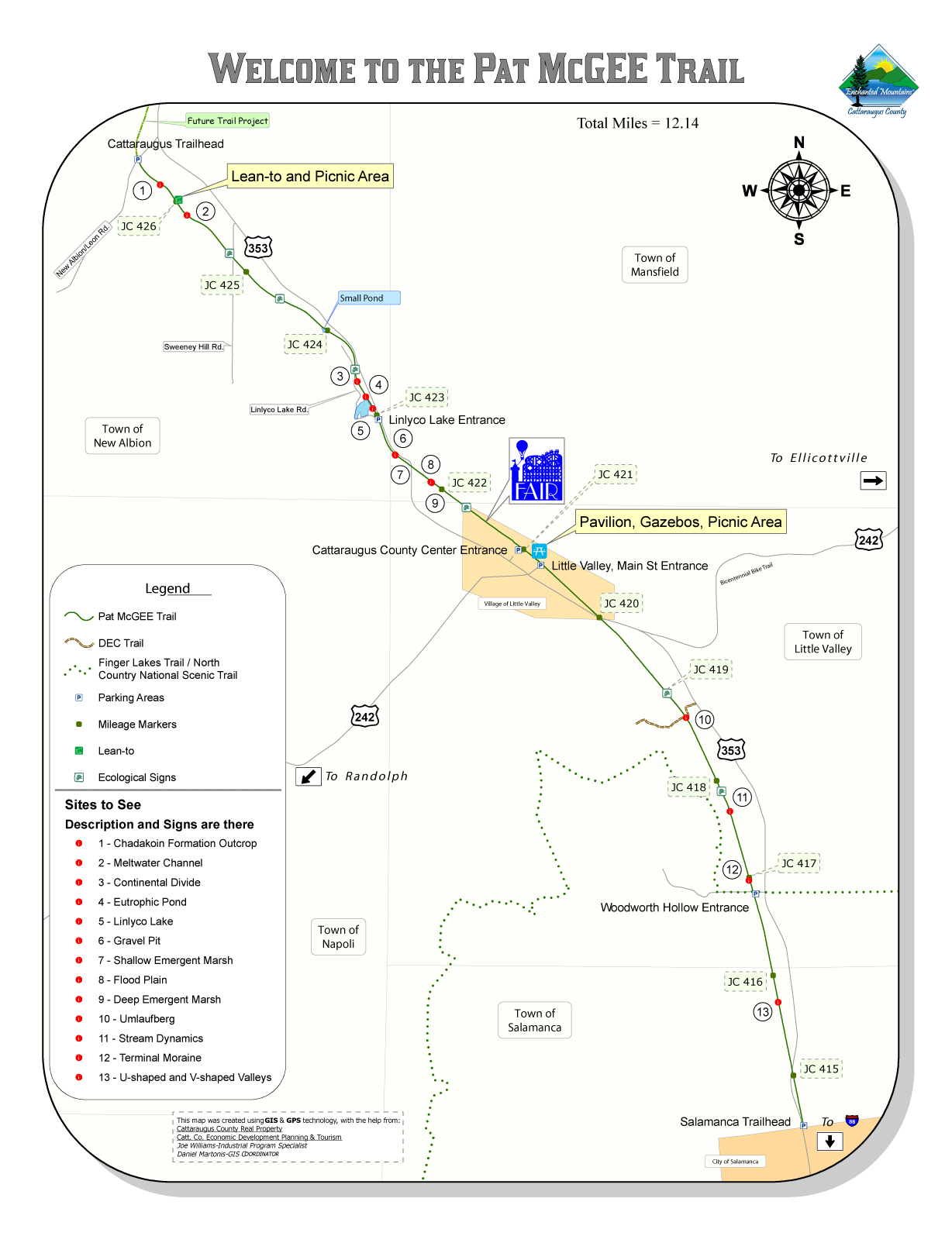 Home » Downloads » Map Pat McGee Trail Map Files Pat McGee Trail Map (revision 2006) File Size: 418.94 KB You can hike, bike, snowmobiling or ride horse on the Pat McGee Trail. This mile multi-purpose 12.2 trail will grow to be a county-wide system but at this time it connects 7 municipalities together (the Village of Cattaraugus to the City of Salamanca). Read more about the Pat McGee Trail on the Pat McGee Trail Page. Activities This file may help you with the following activities: Bicycling Hiking Horseback Riding Snowmobiling Updated on Wed, 12/12/2018 - 3:26pm. Categorized in Map Bicycling Hiking Horseback Riding Snowmobiling Login to post comments Email this page Photos tagged as #EnchantedMountains or #EMFun. @emountains