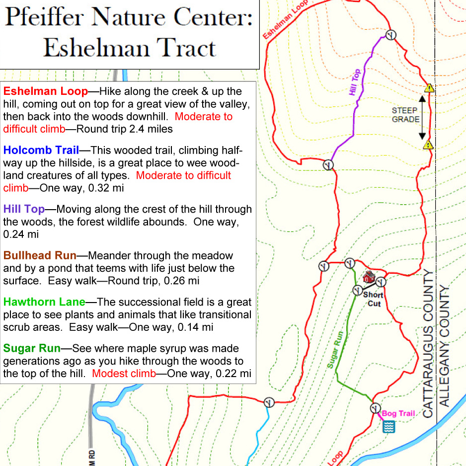 Home » Downloads » Map Pfeiffer Nature Center Eshelman Trails Map Files 2018 Map of the Eshelman Trails at Pfeiffer Nature Center File Size: 1.14 MB Map of the Eshelman Trails at Pfeiffer Nature Center File Size: 525.45 KB We can learn so much from nature at Pfeiffer Nature Center's Eshelman property. The attached map is of the Eshelman Tract of land listing the trails and geographic features. Pfeiffer Nature Center's Eshelman Tract has the following trails: Eshelman Loop - Hike along the creek & up thehill, coming out on top for a great view of the valley,then back into the woods downhill. Moderate todifficult climb - Round trip 2.4 miles Holcomb Trail - This wooded trail, climbing halfwayup the hillside, is a great place to wee woodlandcreatures of all types. Moderate to difficultclimb - One way, 0.32 mi Hill Top - Moving along the crest of the hill throughthe woods, the forest wildlife abounds. One way,0.24 mi Bullhead Run - Meander through the meadowand by a pond that teems with life just below thesurface. Easy walk - Round trip, 0.26 mi Hawthorn Lane - The successional field is a greatplace to see plants and animals that like transitionalscrub areas. Easy walk - One way, 0.14 mi Sugar Run - See where maple syrup was madegenerations ago as you hike through the woods tothe top of the hill. Modest climb - One way, 0.22 mi If you have any questions please contact us. Activity These files may help you with the following activity: Hiking Updated on Wed, 12/12/2018 - 3:51pm. Categorized in Map Summer Hiking Login to post comments Email this page Photos tagged as #EnchantedMountains or #EMFun. @emountains