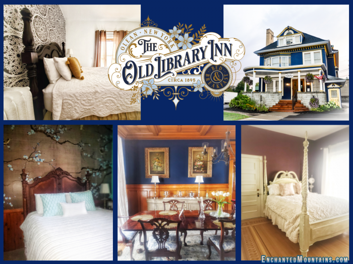 Home » Places The Old Library Inn The Old Library Inn is the Southern Tier's most unique boutique inn, full of modern Victorian charm. Come discover what it means to fall in love with Olean on one of our city's most beautiful streets, in one of the Southern Tier's most enchanting locations. Since its construction in 1895, the beautiful Victorian house at 120 South Union Street has been home to a local oil producer, a community physician, and Olean's first Bed & Breakfast. Nestled in the heart of downtown Olean, this charming, historic inn surrounded by the Enchanted Mountains is the perfect place to relax and unwind. The Old Library Inn features a modern Victorian style with rich architectural details and vibrant accents. Each of our guestrooms are uniquely styled and dedicated to honor our favorite distinguished authors. All our rooms feature cozy beds, cable TV, air-conditioning, wireless internet access, hair dryers, amenities, and a private bath. Our beautiful Victorian Inn is just steps to the numerous recreational activities & cultural attractions in Cattaraugus County; including dining, shopping, hiking, biking, water sports, snowshoeing, ice skating, skiing & vibrant fall foliage. Explore the riches of St. Bonaventure University, Seneca Allegany Casino, the Basilica of St. Mary of the Angel's, Allegany State Park, Letchworth State Park, Rock City Park, and of course, our rolling Enchanted Mountains. Olean's historic district, downtown shops, and captivating scenery provide endless sightseeing and entertainment for all. Don’t visit Western New York like a tourist. Experience it like you live here. The Old Library Inn 120 South Union Street Olean, NY 14760 United States Phone: 716-372-7775 42° 4' 36.2604" N, 78° 25' 48.6588" W Website: www.theoldlibraryofolea ... Lodging Information Number of Rooms: 7 Number of Suites: 1 Hot Tub: No Refrigerator: Yes Kitchenette: No Air Conditioning: Yes Fitness / Gym: No Fireplace: Yes Bar: No TV: Yes Breakfast: Full General Information Wheelchair Accessible: No Parking: Yes RV Parking: No Bus Parking: No Pets Allowed: No Accepts Credit Cards: Yes Internet Access: Yes Conference / Meeting / Banquet: No Playground: No Indoor Pool: Unknown Outdoor Pool: Unknown Swimming: None Boat Launch or Dock: Fishing Access: Nearby Equestrian Trail Access: No Bicycle Trail Access: Yes Hiking Trail Access: Yes Mountain Biking Trail Access: No Snowmobile Trail Access: No Please note Please note that this information may change and may be incorrect The Old Library Inn is categorized in Autumn Spring Summer Winter Hotels & Motels Olean Email this page Photos tagged as #EnchantedMountains or #EMFun. @emountains