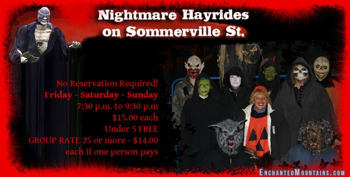 Home » Blog » 2011 » 10 Nightmare Hayrides Adventure by Holiday Inn Express Employees by Debra O on Oct212011 On October 16, 2011 the Holiday Inn Express crew took a NIGHTMARE HAYRIDE ADVENTURE! Talk about a fun staff adventure!! Those of you that did not join us, missed a very fun time and the giggles and screams could be heard for quite a ways!! What a FUN night that Erika and her daughter, Willa, Dottie, Melissa and her son, Sheila, Jim, Brittany, Todd, Ted, Sherry and Jim had. Even though the weather was pouring rain, there was mud and mud puddles, they had a Fantastic time on the NIGHTMARE HAYRIDE. In fact, they wanted to do it twice!! And they said they were going to do an article to go in the newspaper about the FUN they had but I decided to do my rendition first. They said they were feeling people up in the dark that they did not know, they were giggling, they were squealing, and they had such wonderfully hysterical stories to tell when they finished the trip. They sure had fun talking about the Spooktacular fun as they sat in the wind and cold eating, drinking and shaking, after the trip through the mazes and tunnels. The food was delicious. Hot Dogs, Hamburgers, Pretzels, Chili, Potato Bacon Soup, cookies and more. Yummy.......the best darn Chili around....soups made by Karen Kent! I heard one man say that he comes "just for the Chili".....wow, what a compliment to that delicious yummy concoction!! I had a bowl of Potato Bacon and it was so yummy good, I took a bowl home with me. (that's another story as when I took the lid off, I spilled it all over me..truly did, all over my face and clothes and anything else in the way..you had to be there....guess I have to go back to get some more!! Keep the pot warm, Karen!!) Those that didn't go, should take the short trip there, as it was something to be talked about for quite some time.....I am sure the stories and giggles will remain being told for weeks to come......or at least till next year when we do it all over again...........screams, giggles, laughter, squeals and stories for days........that is what the FUN was all about!! It goes without saying, that John and Karen Kent are the most gracious of hosts and they made the trip, in the pouring rain, well worth everyone's while. If you don't know them, you should. They run the most wonderful Nightmare Hayride and the best of the best, Ellicottville Rodeo. If you haven't been to either of these fantastic events, then you are missing out on life, that is for sure. They are so dedicated and everything they do is safe and FUN for all ages. And they are right in our backyards. So, take advantage of it....go take the Nightmare Hayride and then July 4th weekend, join them for the Ellicottville Rodeo. They are close by, right here, and you will have lots of fun!! And the food is always YUMMY!! Ok, the truth is that Ruth Ann didn't go in the tunnel or take the Hayride.........she is a scardy cat for sure......she got to sit in the food shelter and kept warm (thanks to John and Karen and their wonderful staff!! There are approximately 75 staff members that assist them every year to make this the best darn adventure anyone could have!!) while others could be heard screaming from afar..........but she had alot of fun listening to the stories about the fun time that they had....that in itself made that rainy, chilly night worth going out into it...........listening to everyone's laughter and comradery made every second of being cold and damp well worth it. (I fell asleep with a smile on my face remembering the smiles on my staff's faces as they all talked about the happenings they just encountered, and they encountered alot of different things that kept them wondering, and some worried, about what would jump out next, or what they would run into or who would run into them!!! What a FUN night I had, as well, just listening and watching them giggle and smile and laugh from the great time they had!!) If you haven't been, you need to hurry as this coming weekend is the last until the next Fun Adventure comes around in October 2012.......Stay happy......Ruth Ann, General Manager, Holiday Inn Express and Suites, Salamanca, NY About Deb O I have lived in Cattaraugus County my entire live. I like to explore and have fun in the Enchanted Mountains!! Filed in Autumn Family Entertainment hayride nightmare Ellicottville Login to post comments Email this page Photos tagged as #EnchantedMountains or #EMFun. @emountains