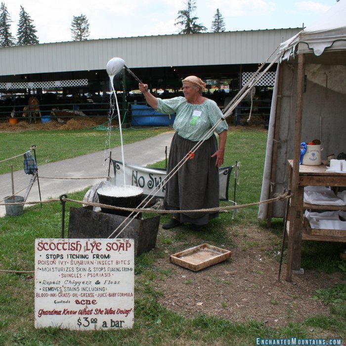 Home » Gallery » Cattaraugus County Fair 2011 Scottish Lye Soap Deborraha Burnett-Carbone ladles Scottish Lye Soap at the 2011 Cattaraugus County Fair. You should stop and talk to her about the differences between American Lye Soap and Scottish Lye Soap and the history that her family has had making soap! Deborraha and other people at the Heritage village at the Cattaraugus County Fair will show and teach you about the ways of the past. See this photo on Flickr of Deborraha teaching kids about old utensils. in Festival soaps Little Valley Login to post comments Email this page Photos tagged as #EnchantedMountains or #EMFun. @emountains